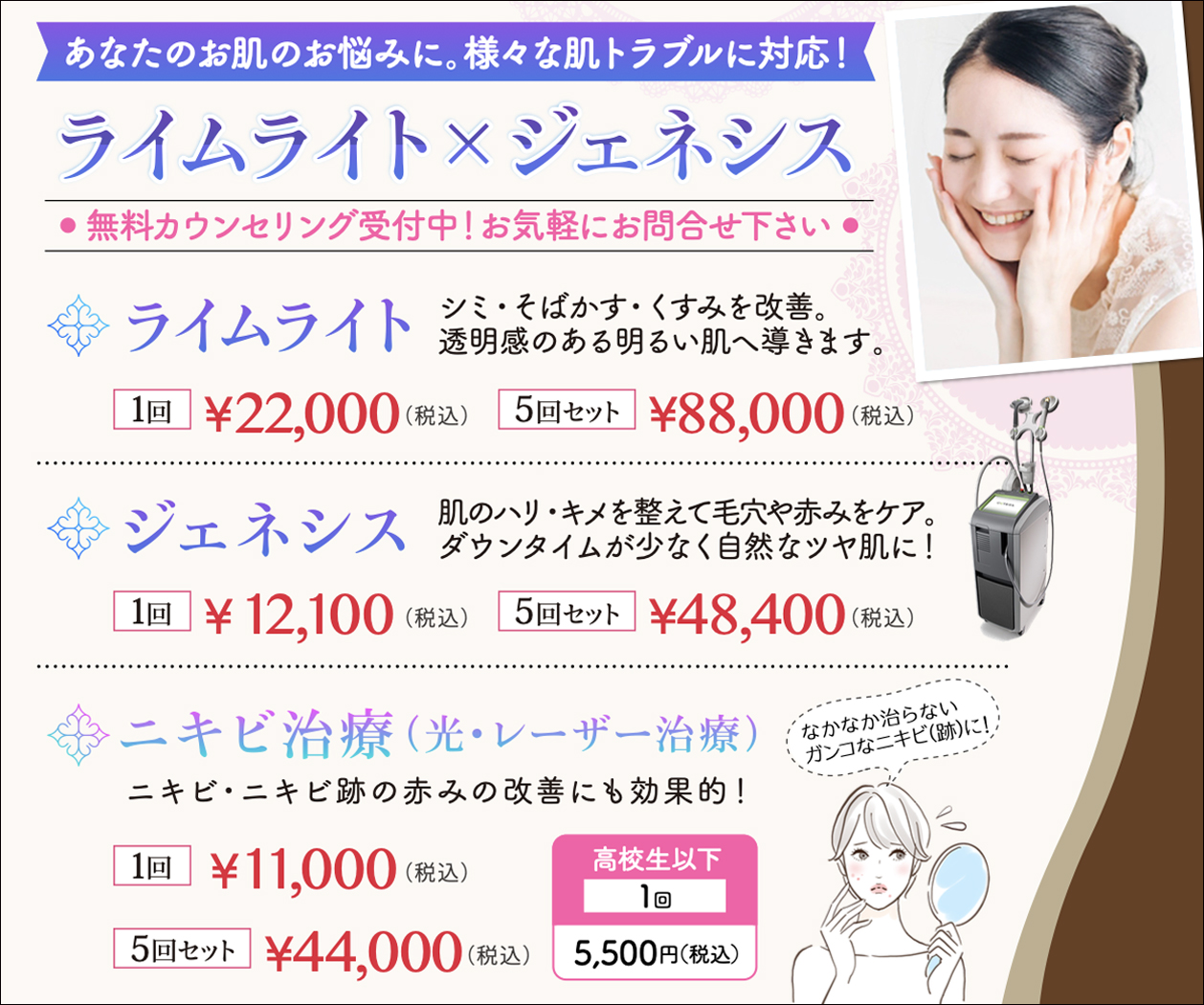 あなたのお肌のお悩みに。様々な肌トラブルに対応!ライムライト×ジェネシス \ 最新情報をチェック / FacebookXBlueskyHatenaCopy 関連記事 🍁 秋冬におすすめ!肝斑治療 🍂 ☀️ 肌を出すこの季節に!医療脱毛 🌺 ☘️🌸 春にオススメ美容メニュー 🌸☘️ ⛄️🍁 秋冬におすすめ美容メニュー 🍁⛄️ +*・:🌻 お得な特典あり!医療脱毛プラン 🌻・:*+ ☀️ 素肌を出すこの季節に!広範囲医療脱毛プラン ☀️ “レチノール ミセル”お取り扱い開始しました!【2024年3月から】 🌸 春のオススメ美容皮膚科ご案内 🌸 ✨☃️ この時期にオススメメニュー!☃️✨ ❄️⛄️ この時期にオススメメニュー! ⛄️❄️